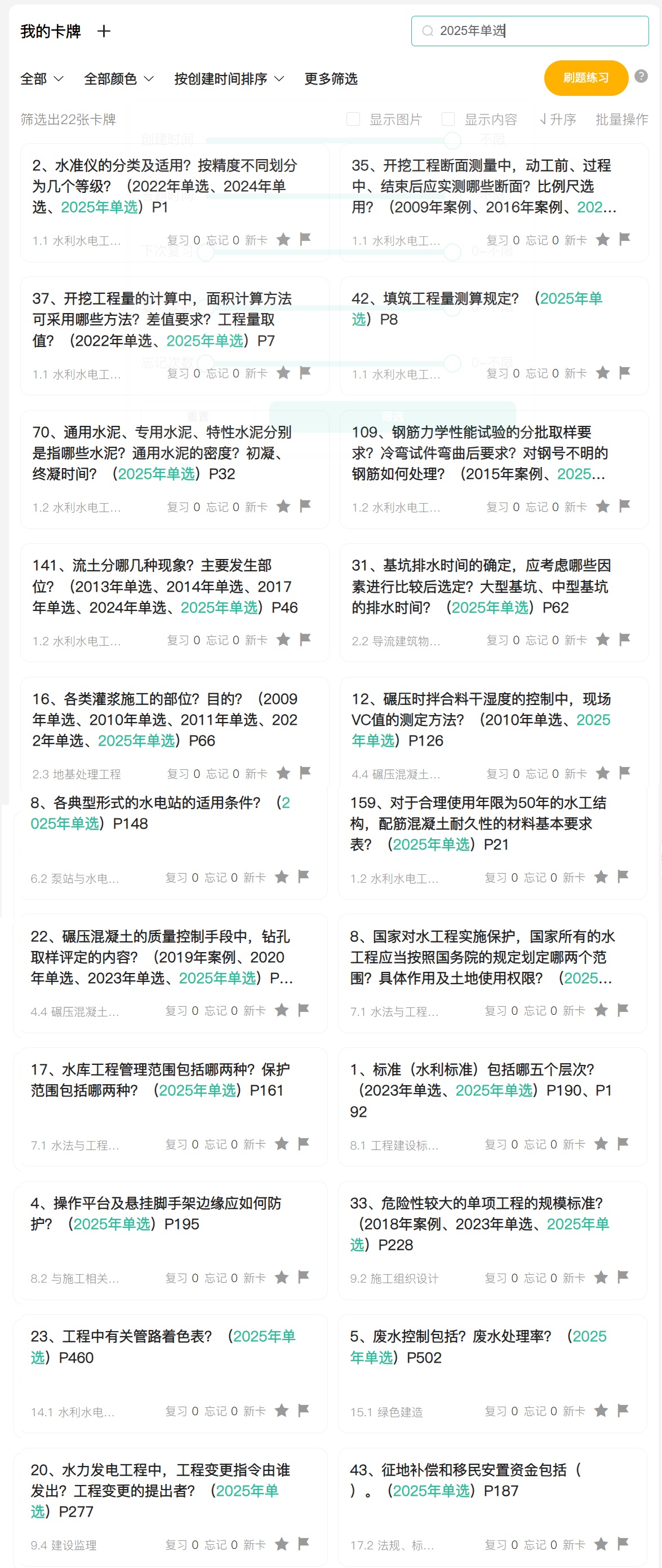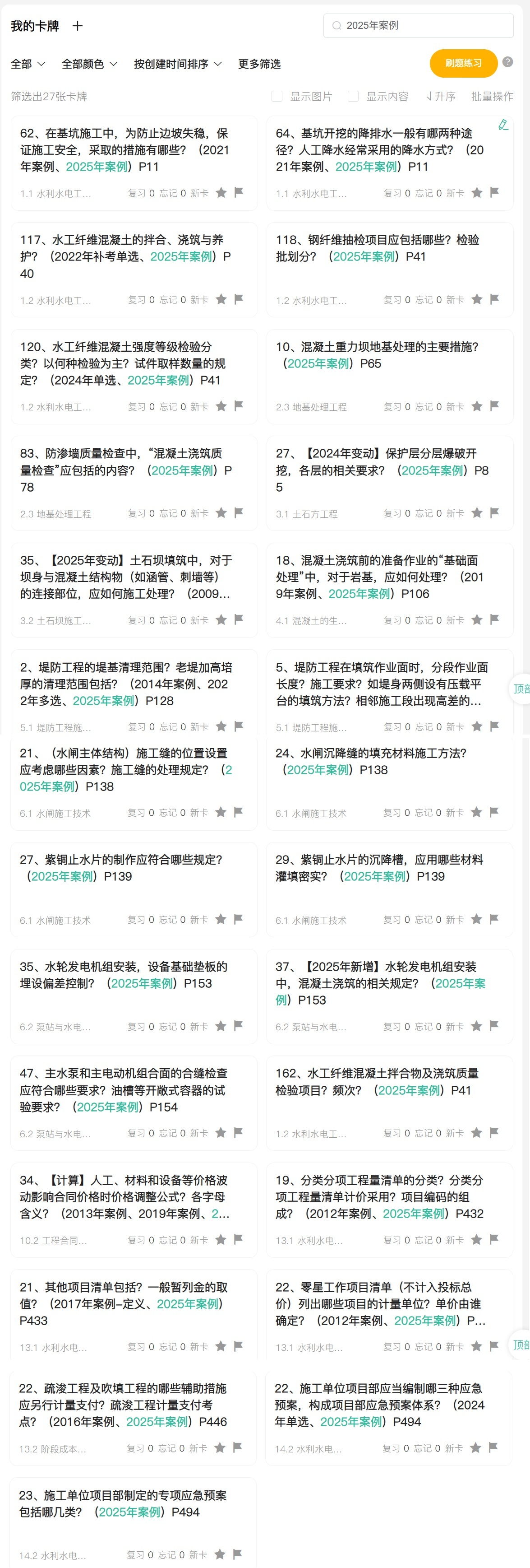 行业下行,有时间就增项个水利水电吧,本次水利卡片依旧延续热的建筑和机电的风格(可参考其他各科介绍截图),沿用2025版新教材,边听网校精讲边制卡,自用资源,不糊弄不马虎。今年各科卡片更是大升级,不仅新增了“页码”、“2026年变动”、“2026年新增”标志,更是将12年真题标注进卡片,有些难学的知识点,卡片配合插入相关图片,使之更易理解记忆,使大家备考有的放矢,事半功倍。