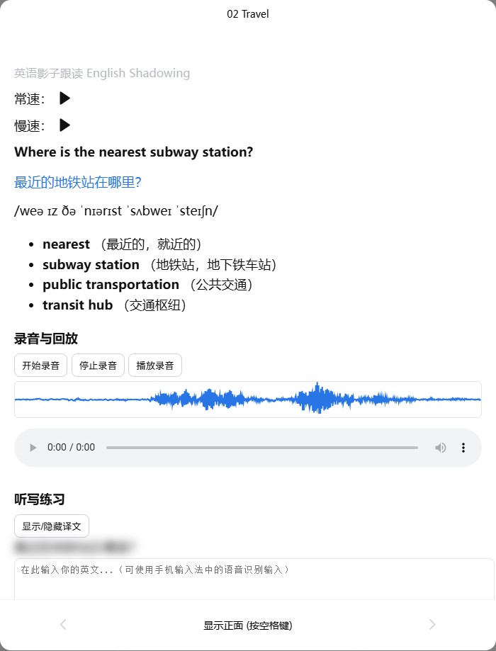 反面:展示句子“重点词汇和固定搭配”。包含录音与回放功能,用户可自检自己的发音。