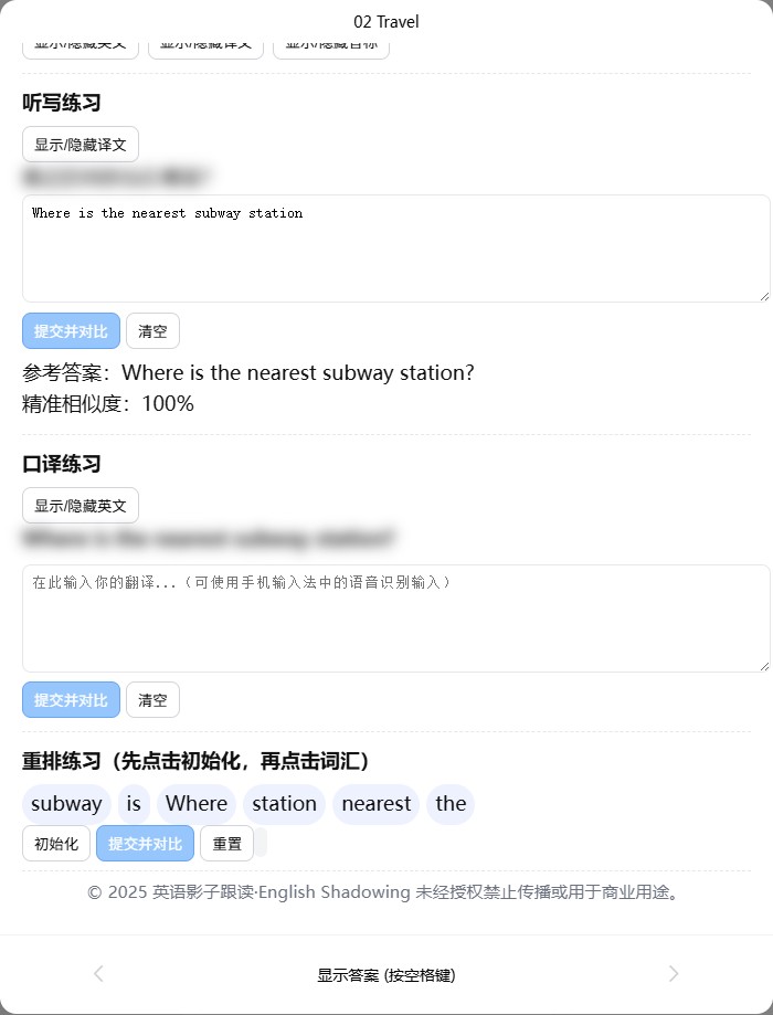 正面:每个句子配有常速音频和慢速音频,两位朗读者。包含听写练习、口译练习、重排练习等。