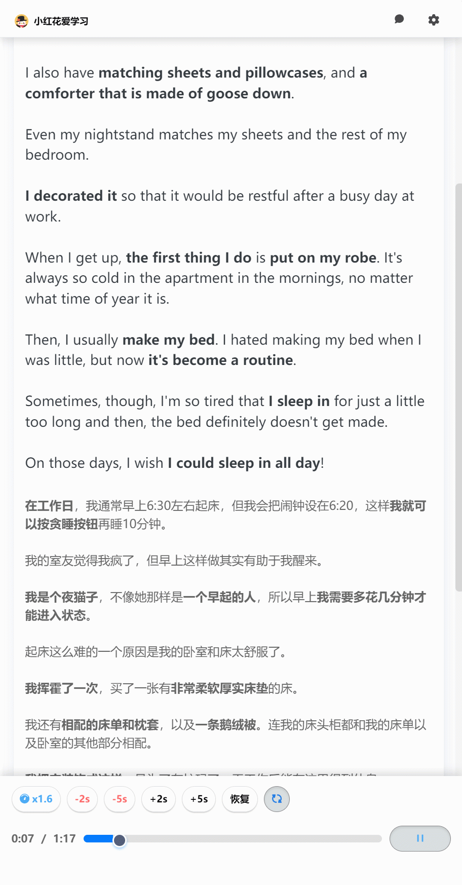- 语速友好、讲解细致:先慢速朗读,再逐词逐句精讲用法、搭配与文化背景,最后常速跟读,适合听力与口语同步提升