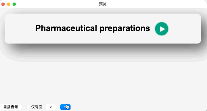 然后,卡片的正面:是英文名词和一个音频的重播按钮。当卡片展示时会自动播放音频,点击按钮支持重新播放。